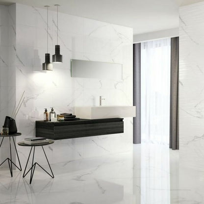Polaris Marble Effect tiles feature a sleek marble effect with natural grey veining across 12 unique face variations | ideal for creating elegant interior designs. Crafted from durable ceramic with a matt finish | these versatile 300x600mm tiles offer both style and functionality.